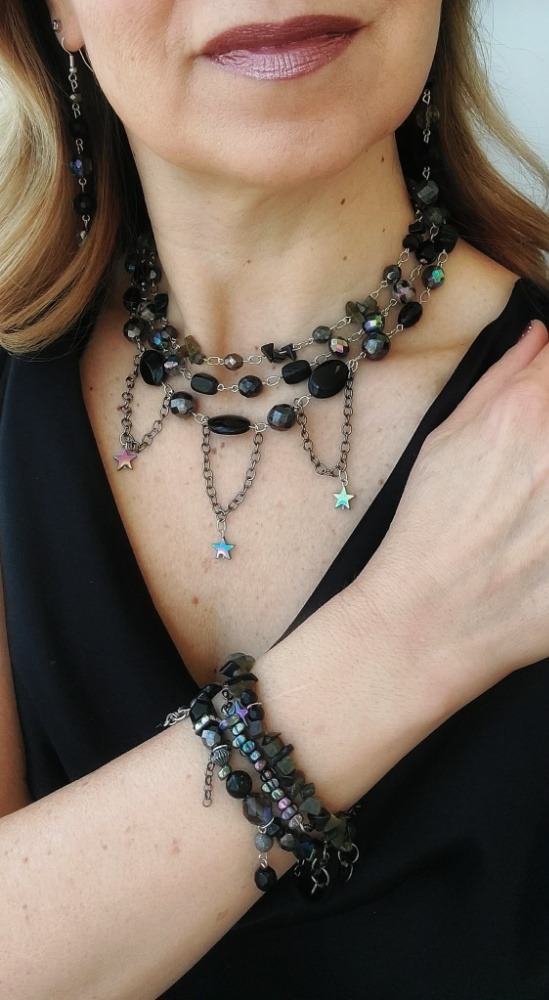 Luminous crystal and glass beads scatter light like fractured starlight — brilliant against the dark. Labradorite flickers with hidden fire, revealing flashes only when it chooses. Hematite carries a cool, liquid-metal strength. Onyx anchors each design in deep, velvety black — steady, grounded, unwavering.