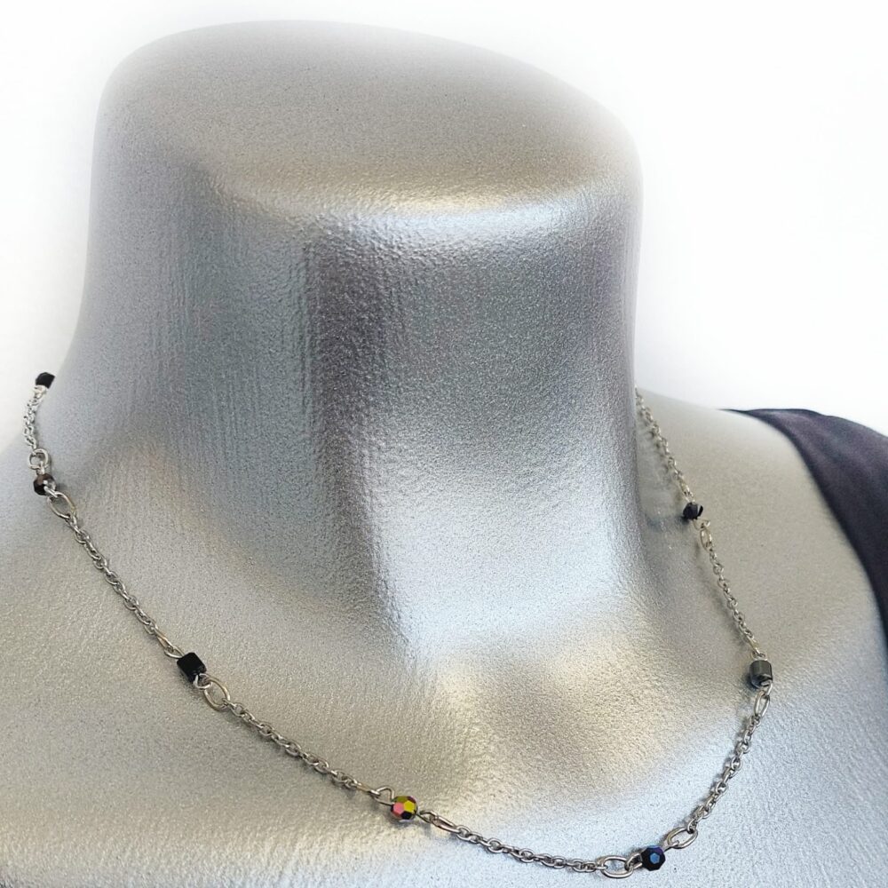 Luminous crystal and glass beads scatter light like fractured starlight — brilliant against the dark. Labradorite flickers with hidden fire, revealing flashes only when it chooses. Hematite carries a cool, liquid-metal strength. Onyx anchors each design in deep, velvety black — steady, grounded, unwavering.