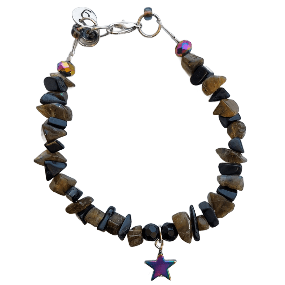 Luminous crystal and glass beads scatter light like fractured starlight — brilliant against the dark. Labradorite flickers with hidden fire, revealing flashes only when it chooses. Hematite carries a cool, liquid-metal strength. Onyx anchors each design in deep, velvety black — steady, grounded, unwavering.