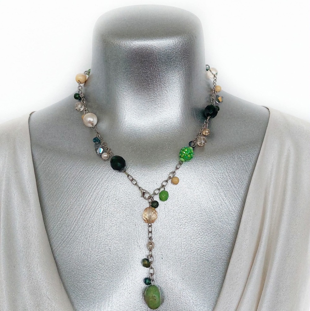 Length: 25 inches with a clasp at the front to easily adjust to the perfect drop length Materials: Crystal, glass and gemstone beads. Chain & Findings: Rhodium plated, hypo-allergenic, and nickel-free
