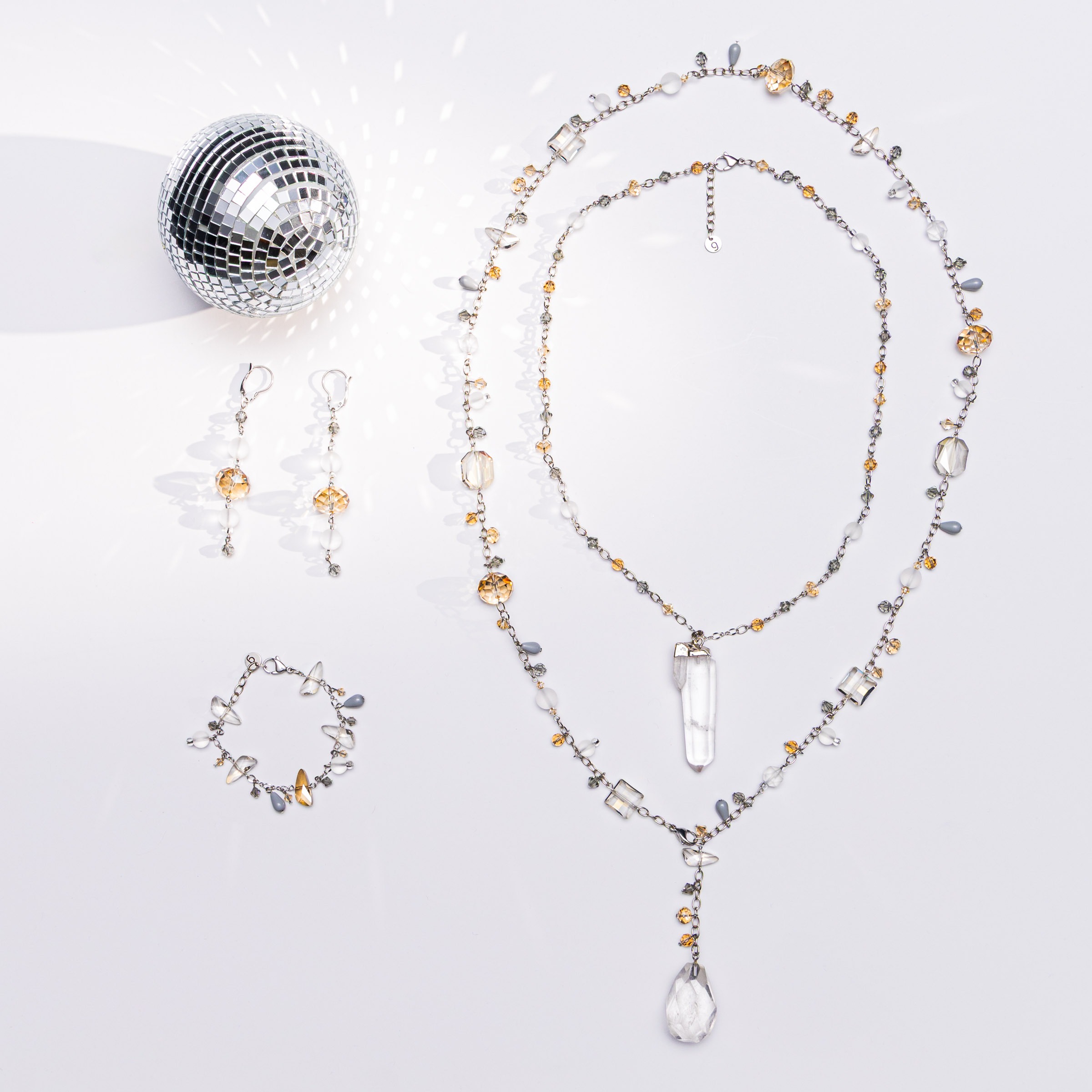 Featuring ice-like quartz pendants and quartz gemstones paired with Swarovski® crystals, chosen for their crystalline clarity and natural luminosity. Together, they evoke frozen fjords, glacial formations, and the subtle shimmer of light reflecting across ice — elemental, still, and breathtakingly serene.