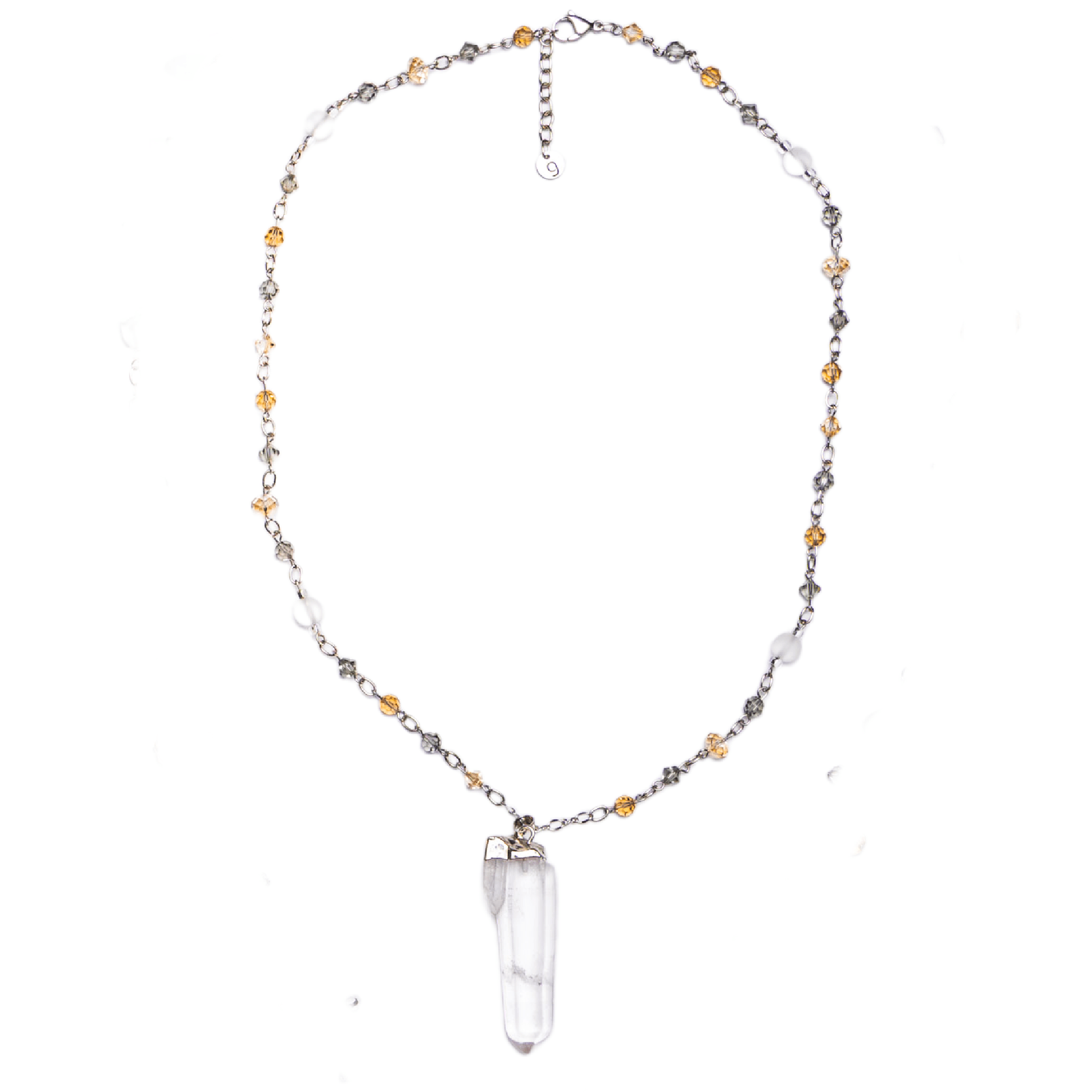 Featuring ice-like quartz pendants and quartz gemstones paired with Swarovski® crystals, chosen for their crystalline clarity and natural luminosity. Together, they evoke frozen fjords, glacial formations, and the subtle shimmer of light reflecting across ice — elemental, still, and breathtakingly serene.