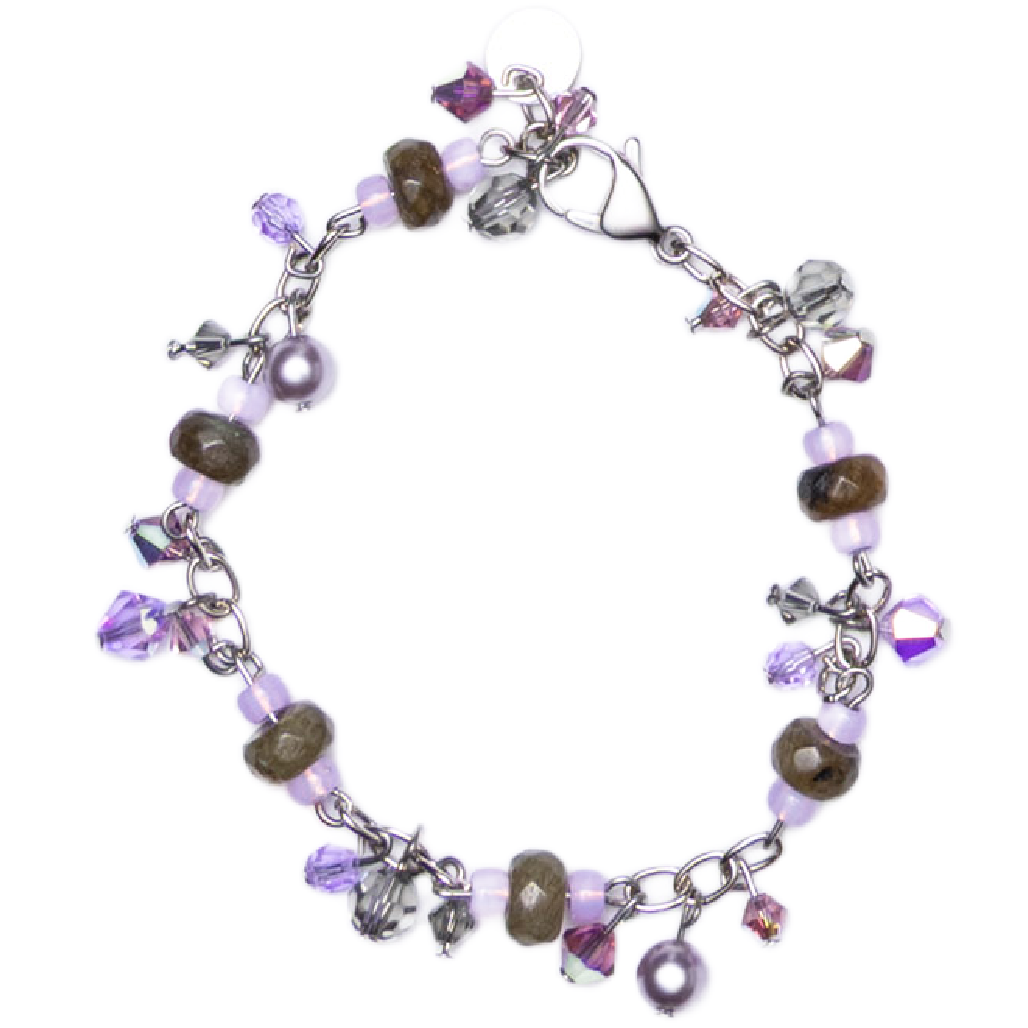 Each piece unites Swarovski® crystals in rich purple and smoky grey with the mesmerizing, natural iridescence of labradorite — elements chosen to echo the desert’s shifting colors as day dissolves into night. Like the glint of starlight against canyon walls, the silvered gleam of sand in the moon’s glow, and the rainbow flash hidden within labradorite’s dark depths, these stones harmonize in a palette of mystery, elegance, and subtle fire.