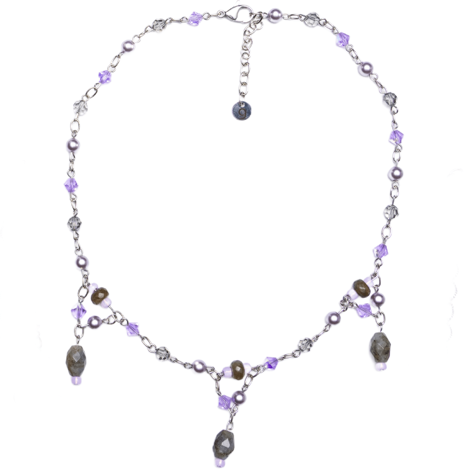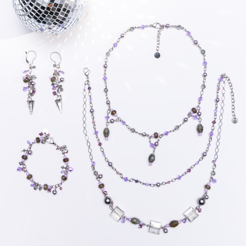 Each piece unites Swarovski® crystals in rich purple and smoky grey with the mesmerizing, natural iridescence of labradorite — elements chosen to echo the desert’s shifting colors as day dissolves into night. Like the glint of starlight against canyon walls, the silvered gleam of sand in the moon’s glow, and the rainbow flash hidden within labradorite’s dark depths, these stones harmonize in a palette of mystery, elegance, and subtle fire.