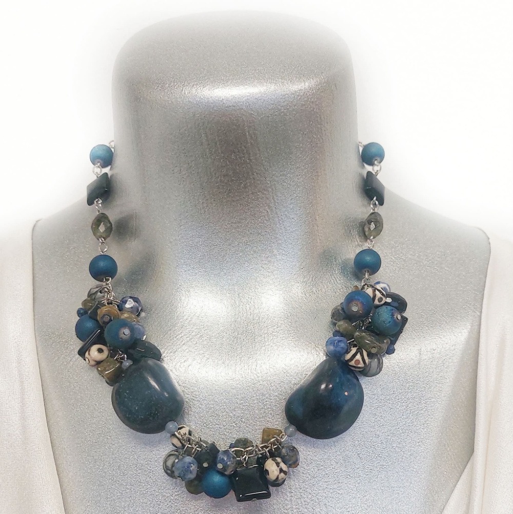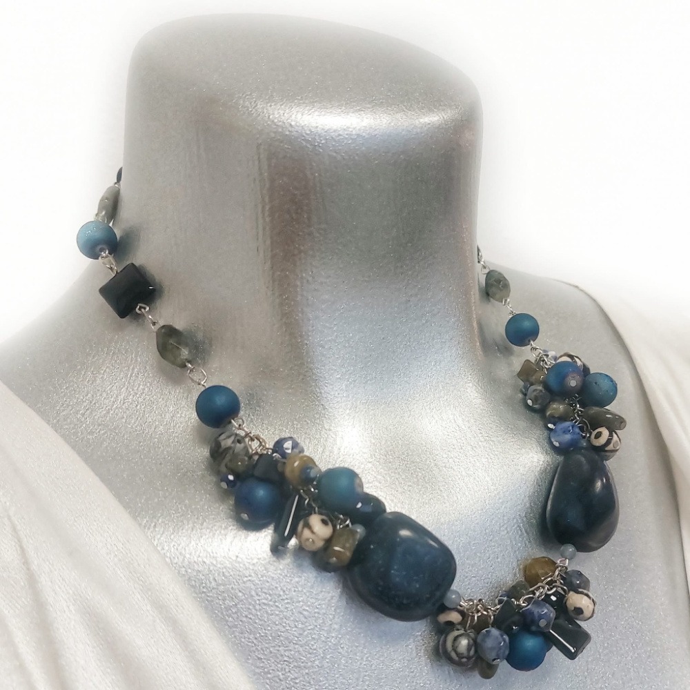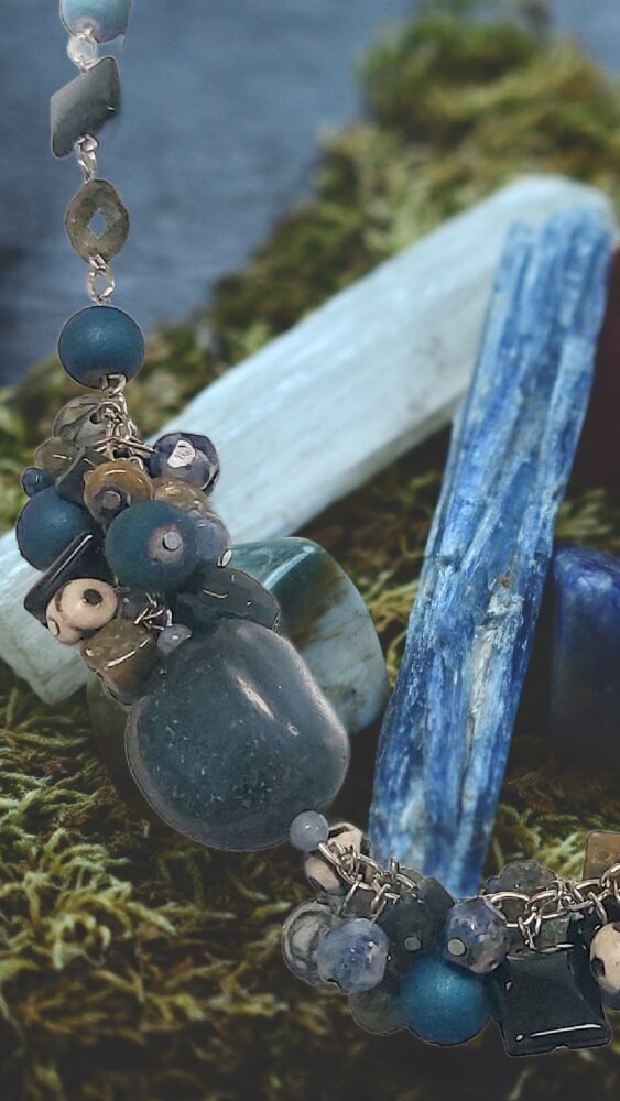 Rich, layered, and intuitive, Celestial Depth weaves together truth, protection, and inner wisdom. Lapis lazuli and labradorite support insight, onyx grounds, agate stabilizes, and druzy agate adds subtle brilliance. This is a statement piece for deep presence and self-trust.