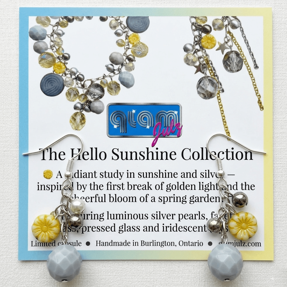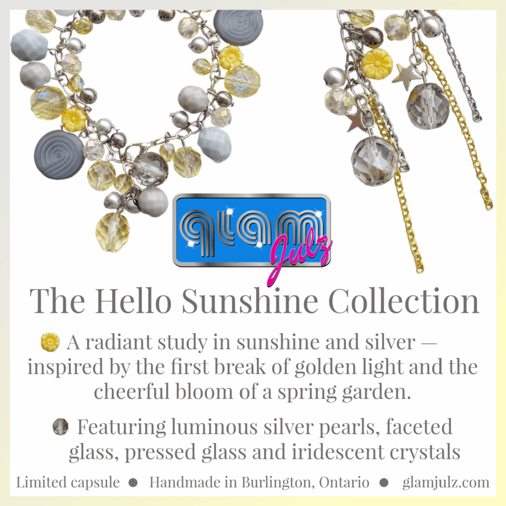 The palette is both optimistic and grounded: brilliant sunshine yellows paired with soft dove greys and shimmering silver accents. Featuring dainty glass “Forget-Me-Not” beads, silver star charms and faceted crystals, these pieces are designed to catch the light and provide an instant mood lift for your customers. Each design maintains a delicate balance between playful texture and refined elegance.