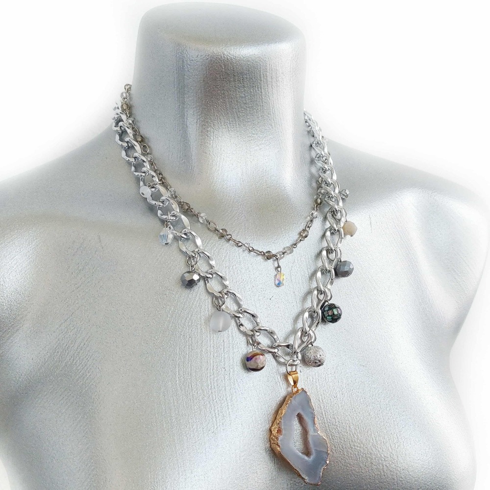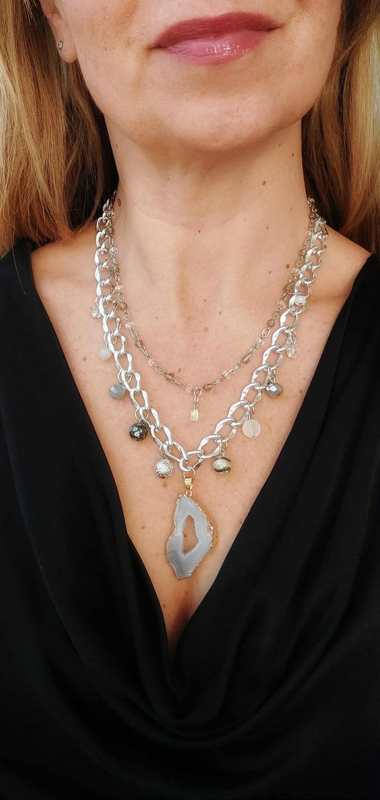 Featuring moonstone, lava rock, quartz, hematite, abalone shell, and shimmering crystal and glass accents, these jewels are made to move with you—through every phase. This piece boasts a stunning agate druzy pendant.
