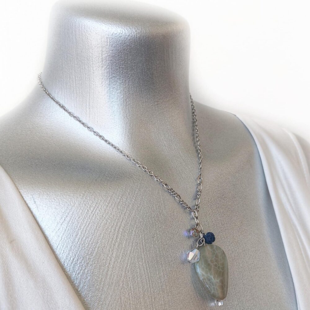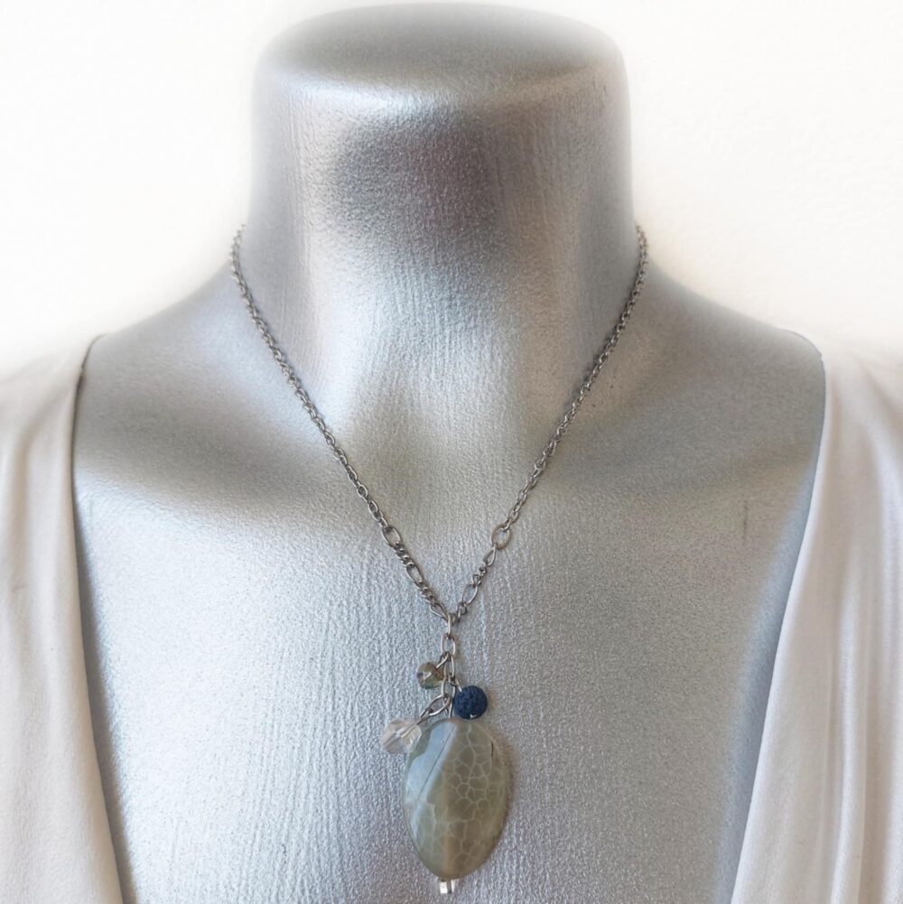 The smooth agate pendant is beautifully accented with shimmering Czech crystals and a delicate lava rock—perfect for infusing with your favourite essential oils like cedarwood or lavender for a signature Canadian scent experience.