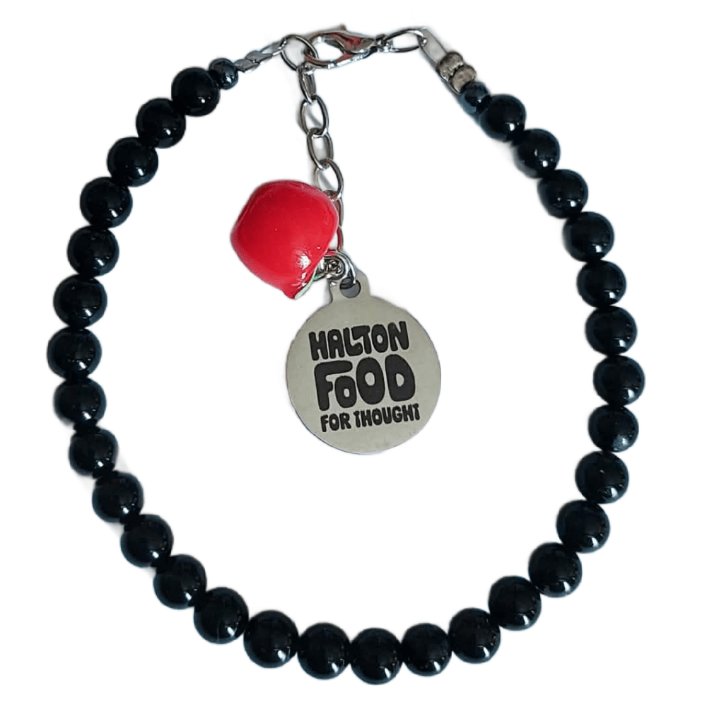 Each bracelet features a signature red apple charm, a custom Halton Food For Thought charm, and colourful glass beads chosen to represent the “Brain Power” that healthy food provides: