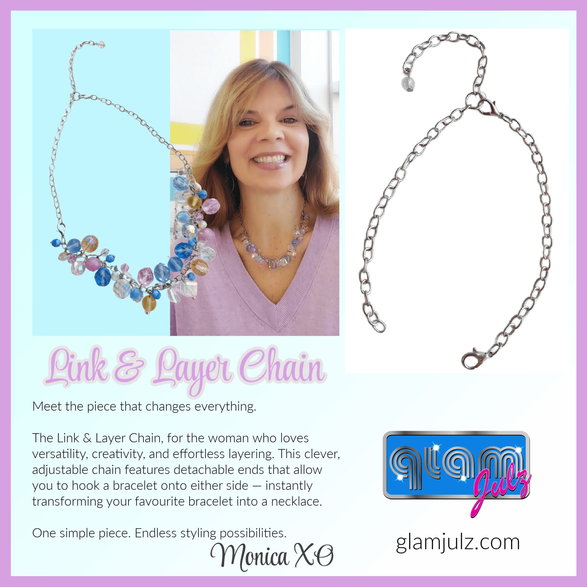 The Link & Layer Chain was designed for the woman who loves versatility, creativity, and effortless layering. This clever, adjustable chain features detachable ends that allow you to hook a bracelet onto either side — instantly transforming your favourite bracelet into a necklace.
