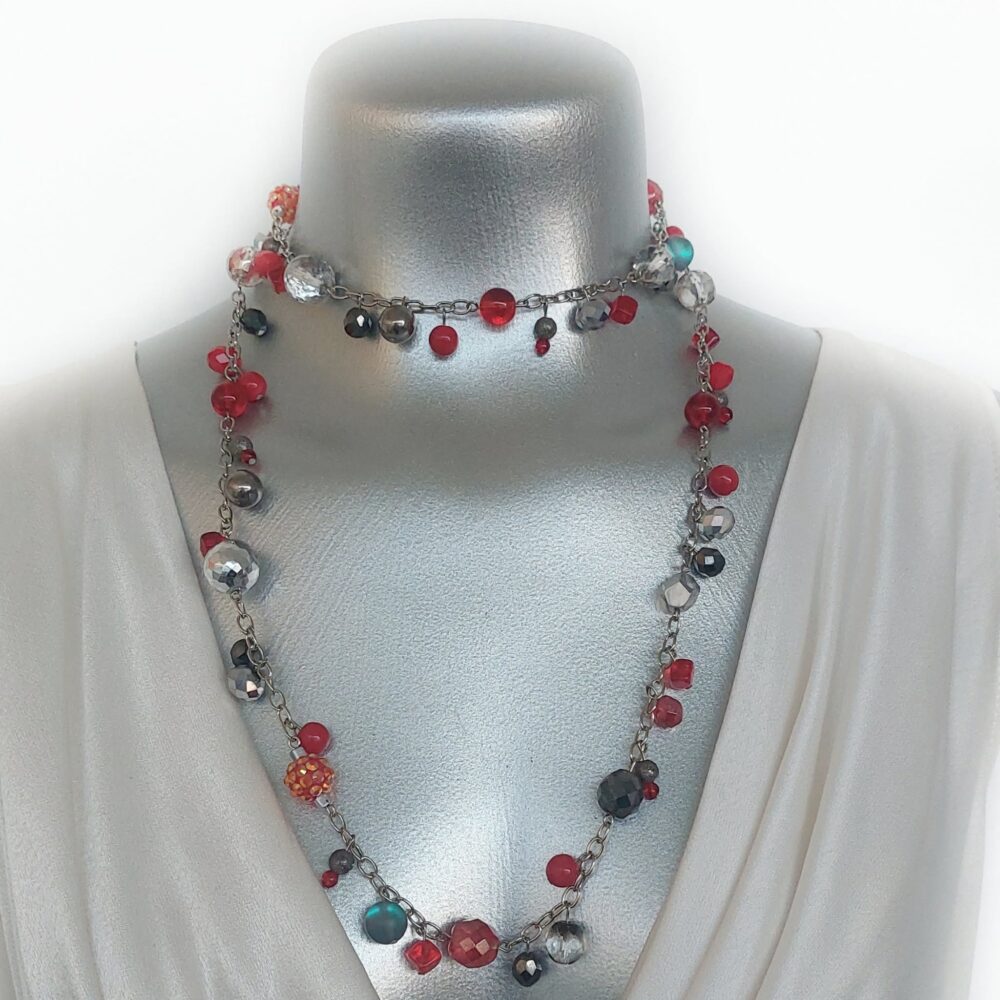 Vibrant, festive, and irresistibly chic, Red Velvet Tinsel reimagines classic holiday red through a couture lens. Crimson elements are paired with shimmering silver and smoky grey, creating a dimensional interplay of colour that feels both playful and polished. The effect is dramatic yet refined — like velvet under stage lights or the first flash of red on a winter runway. This necklace brings a touch of spirited glamour to any ensemble, making it a true standout for celebrations and nights that deserve sparkle.